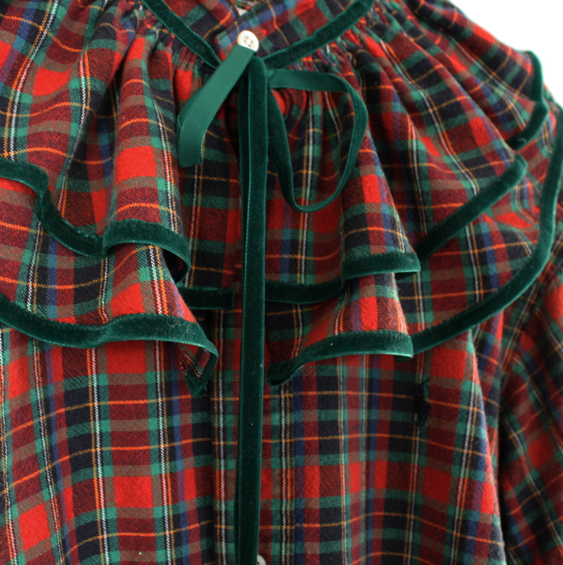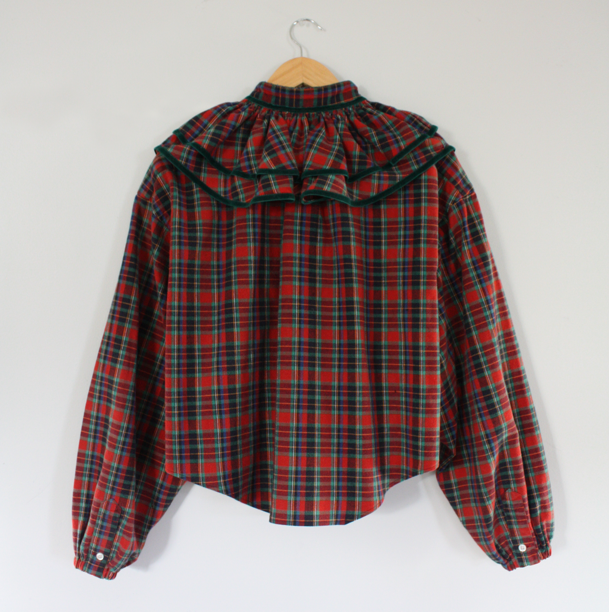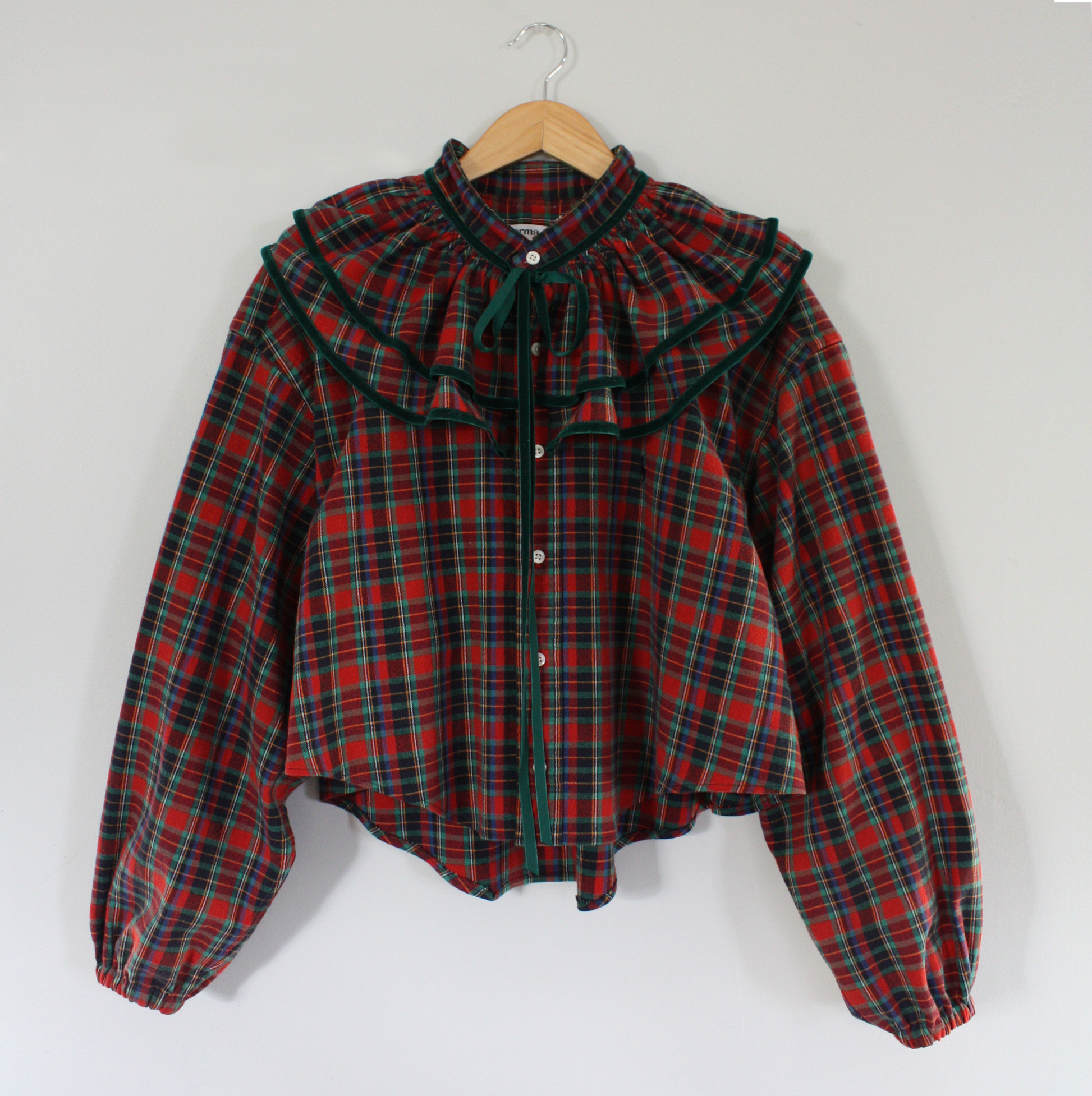 Redone from an XXL Ralph Lauren button down. Velvet trimmed ruffled collar, button through placket and elasticated sleeves. This top will fit a range from XS-XL, with variance on lengths depending on your height.
