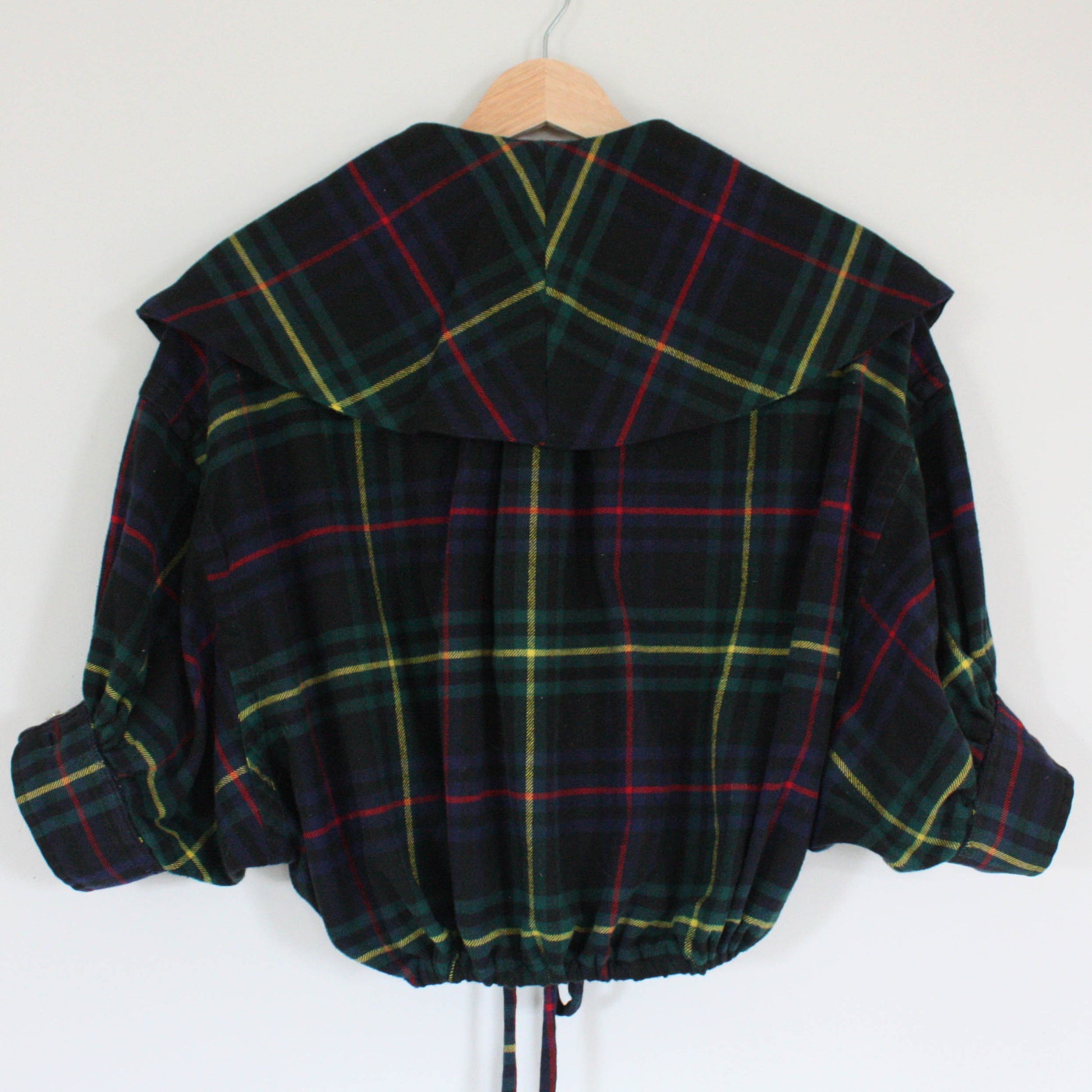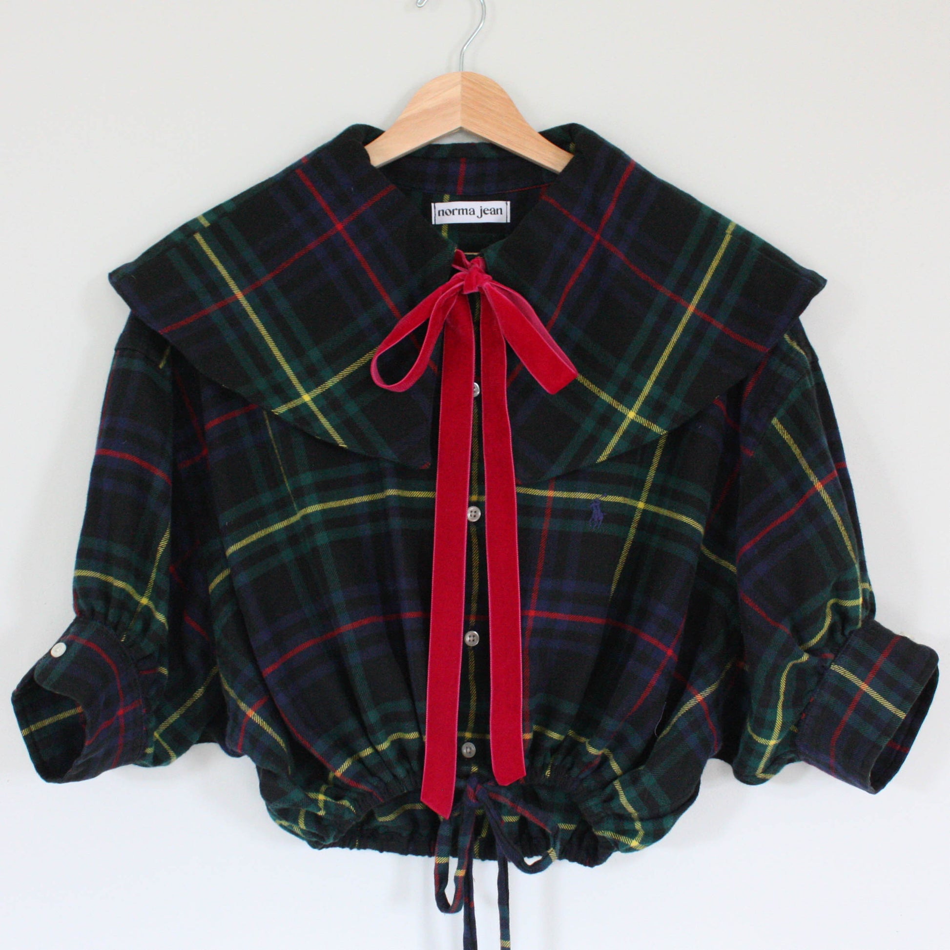 Redone from an XL Ralph Lauren button down. Large collar, button through placket and functional drawstring at hem. This top will fit a range from XS-L, with variance on lengths depending on your height. Please check the armband measurement below as that is the only fixed measurement.