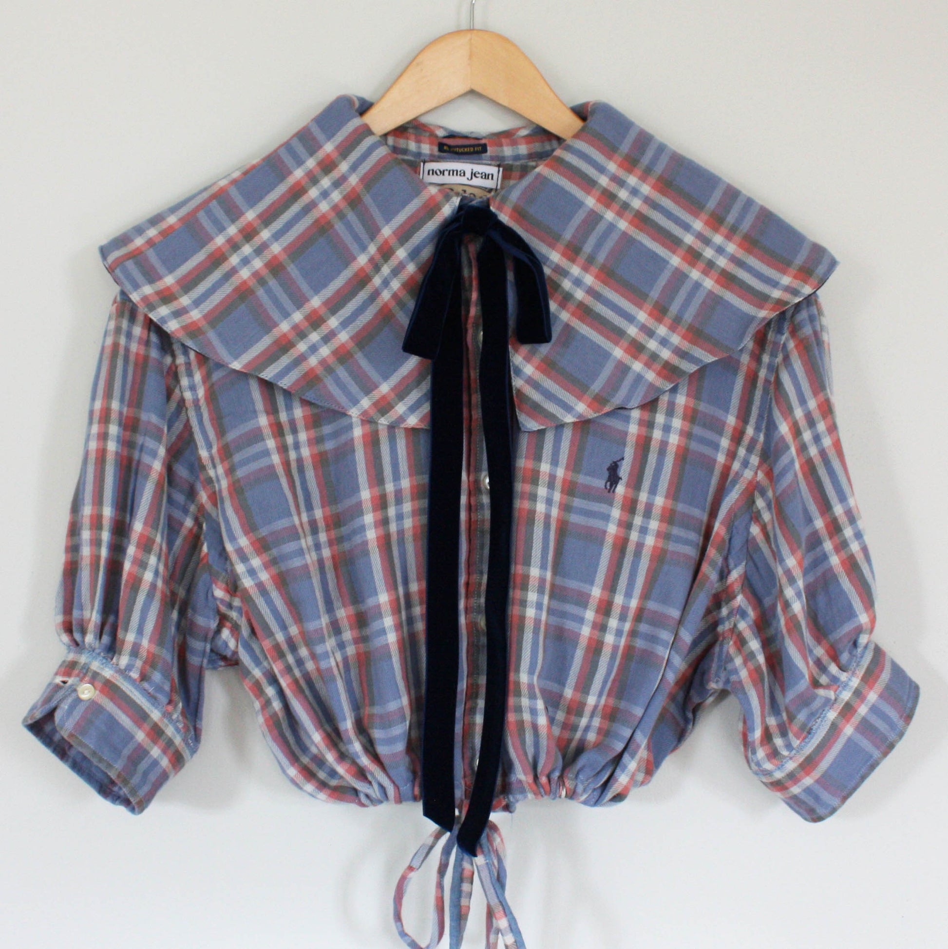 Redone from an XL Ralph Lauren button down. Large collar, button through placket and functional drawstring at hem. This top will fit a range from XS-L, with variance on lengths depending on your height. Please check the armband measurement below as that is the only fixed measurement.
